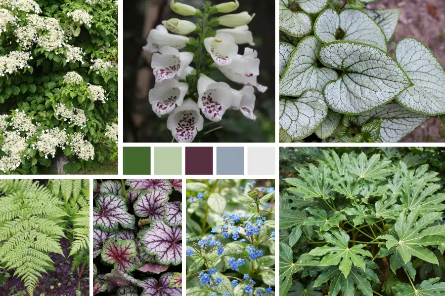 Du côté de la partie à mi-ombre, on y retrouvera une végétation plus abondante et luxuriante. Des arbustes qui structurent immédiatement l’espace, et des végétaux bas aux textures variées capables d’illuminer les zones ombragées. Pour finir on y trouvera d’autres petits arbustes de sous-bois qui apportent des touches de couleurs subtiles et un rythme tout au long de l’année.