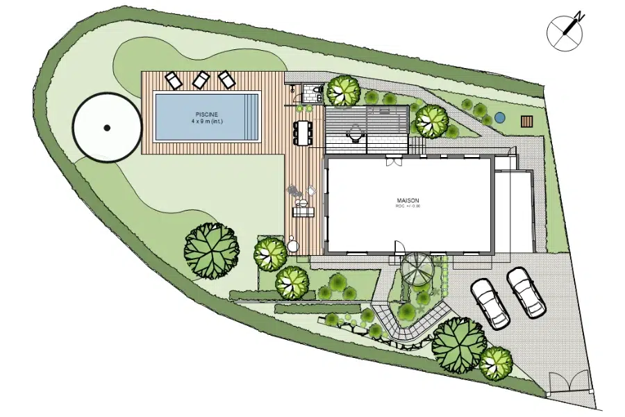 Nous allons reconfigurer toute la zone nord-ouest du terrain pour accueillir les nouvelles constructions. La topographie en sera légèrement ajustée. Les déblais issus du creusement de la piscine serviront à créer une plateforme stable, soutenue par un mur de gabions, destinée à la terrasse et à la pergola.